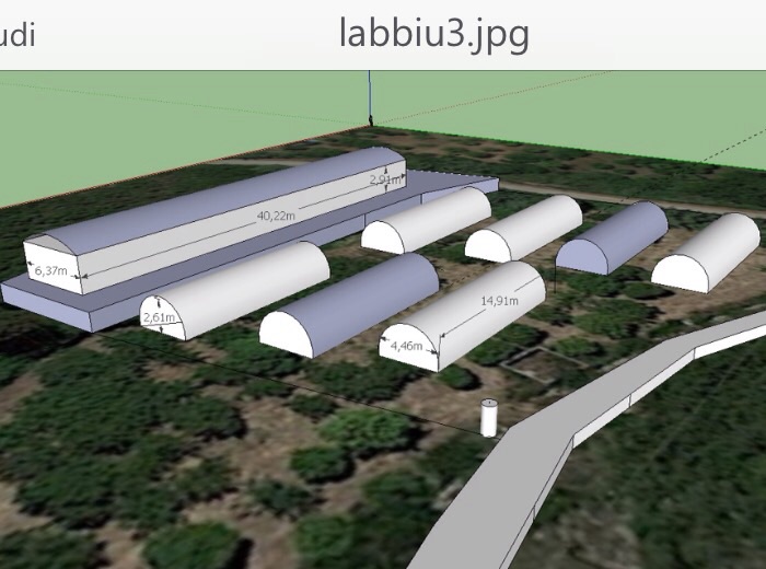 innanzitutto grazie per la disponibilità espressa. I volumi disegnati sono stati inseriti in modo tale da stimare la possibile superficie da utilizzare per l'impianto. Non avendo idea di quali siano le dimensioni consigliate per questo tipo di coltura, si tratta solo di una bozza.