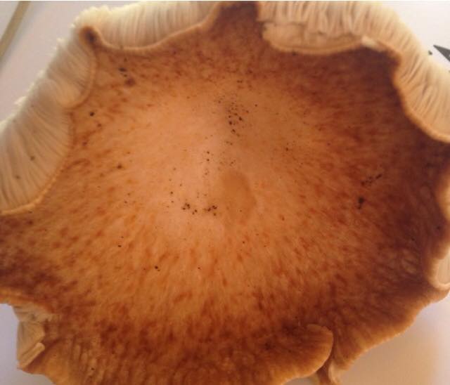 Si scusatemi, questo è uno dei funghi che io ho tagliato e come si può vedere sia la forma che il colore sono un po discutibili. Sono usciti anche dei puntini quindi non so cosa potrebbe essere, anche altri funghi sono diventati cosi. Altri invece hanno interrotto la loro crescita, con il gambo che diventava di un marroncino chiaro e che quindi ho tagliato anch'essi. Cosa può essere?
