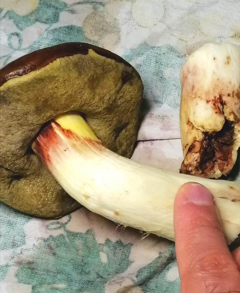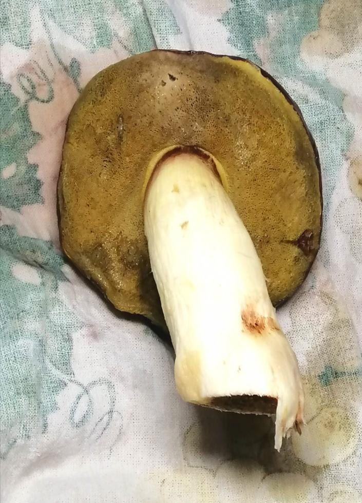 La colorazione che vedi marrone all'interno del gambo e per causa dei vermi che lo hanno invaso durante il completamento di maturazione. Scavano infinite gallerie nella carne del fungo e se non raccolto in tempo invadono anche il cappello. In questi casi eliminare il gambo se non è stato larvato anche il capello. Tu forse non li hai notati dopo il raccolto. I vermi se il fungo resta all'aria per qualche ora fuggono è non si notano. Se lo sezionavi dopo il raccolto li avresti visti. Quel genere appartiene al gruppo degli Appendiculati famiglia Boletaceae, sono commestibili ma particolarmente delicati per l'attacco dei vermi. Si raccolgono quelli in buono stato. In misto di funghi sono molto appetibili.