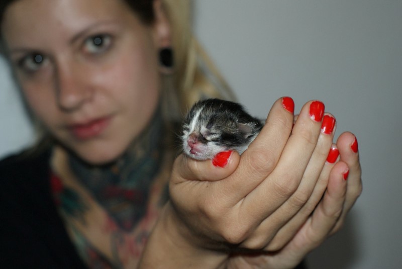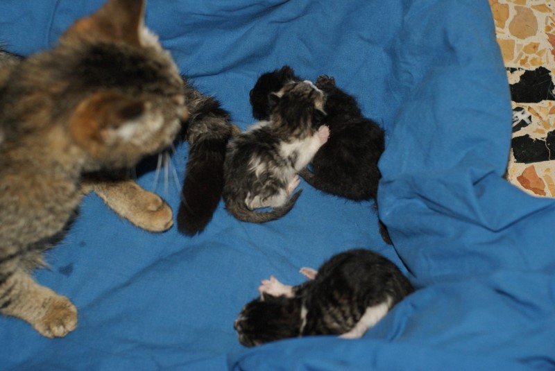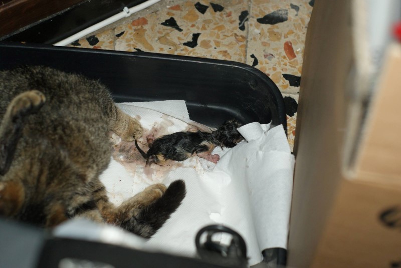 è stata abbastanza assurda come cosa..come tutti i nostri gatti è abbastanza vagabondo staziona nel tetto del fienile e gira spesso intorno alla casa e al terreno circostante..ieri sera era sul balcone della finestra che mi chiedeva di entrare abbastanza insistentemente..purtroppo avevo gente a cena e non gli ho dato troppo peso..dopo un'oretta, a casa sgombra sono tornato alla finestra per farla entrare e ne aveva partorito uno sul balcone..appena aperto si è fiondata dentro con il micetto in bocca e si è nascosta..a quel punto gli ho preparato la cassetta imbottita, ho spostato il piccolo dentro e lei si è trasferita per finire il lavoro..mi sono emozionato, voleva a tutti i costi farli in casa, è la prima che si comporta così!!