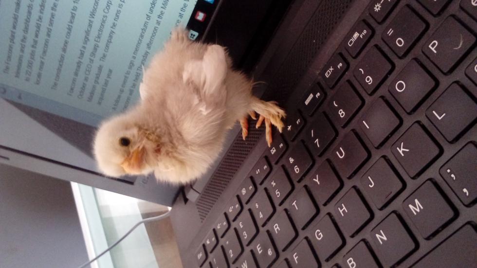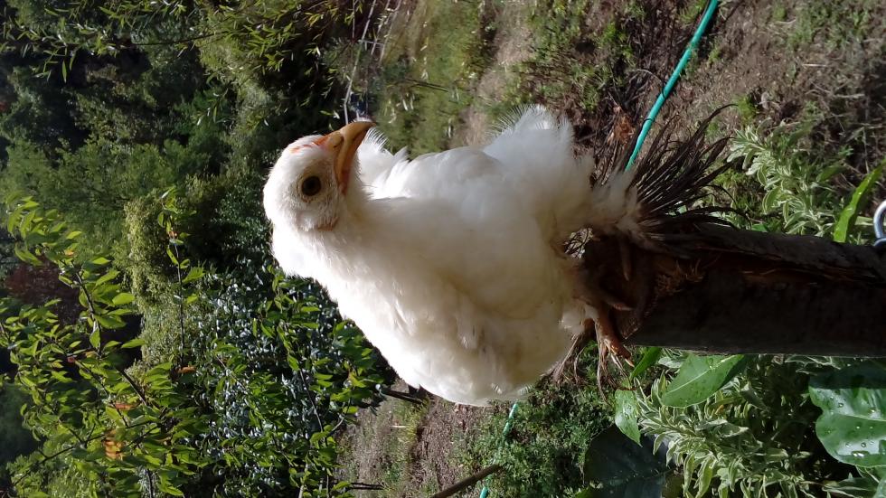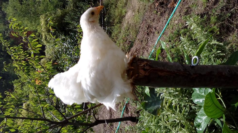 Sta sempre vicino alla sorella e alla chioccia...ha paura dei gatti e di mio marito...se sente la mia voce, mi vola incontro e mi si posa sul braccio..