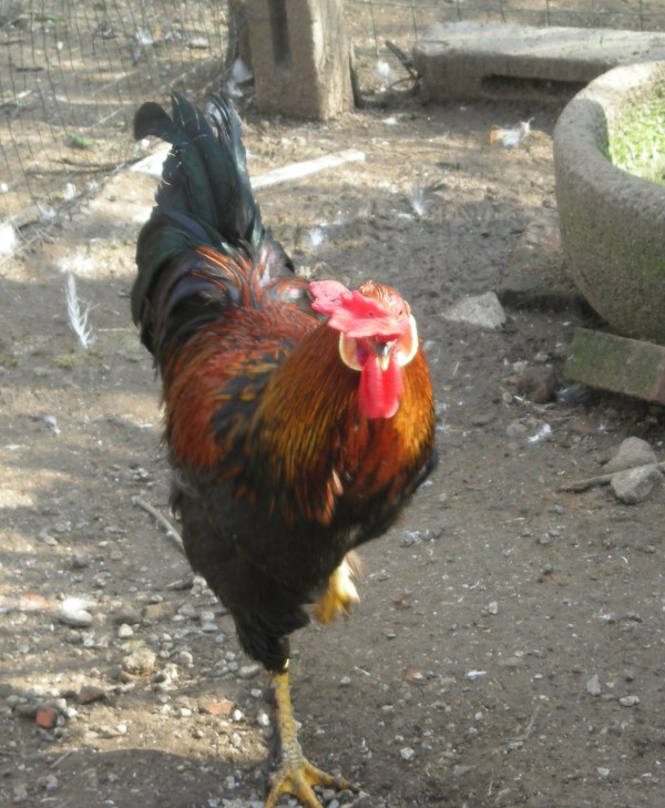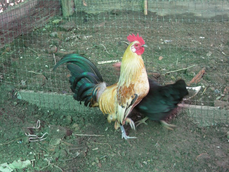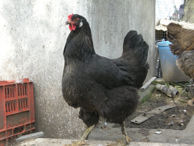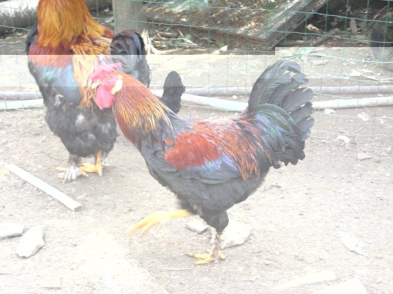 anch'io metterò delle foto di ibridi nati per caso, non frutto di esperimenti mirati: i primi derivano da livorno nera X brahma perniciata a maglie nere. le galline sono nere, i galli neri con parti rosse,gli orecchioni bianchi, tarsi piumati, la cresta è una via di mezzo tra quelle dei genitori, con tre lobi, la mole è notevole, l'accrescimento lento specialmente nel gallo.