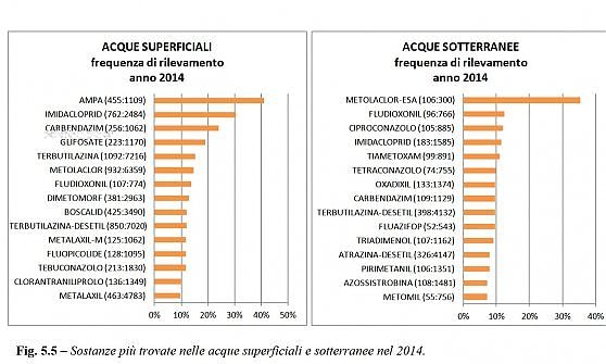 L'inquinamento è più diffuso nella pianura padano-veneta, anche perché lì sono più frequenti i monitoraggi. Fra le sostanze rilevate più spesso c'è il glifosato, insieme al suo prodotto di decadimento, l'Ampa.