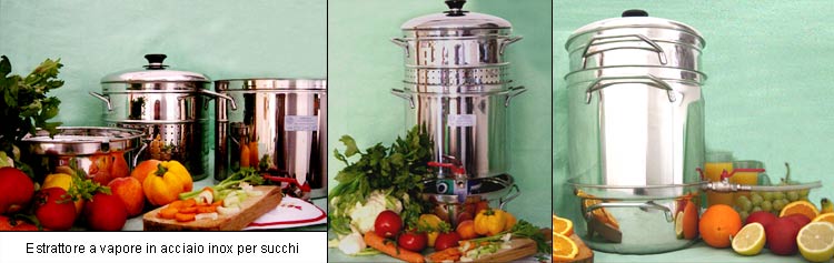 Salve io ho utilizzato queste pentole, qualcuno di voi le conosce? vedi file allegato Con la pentola piccola si produce in media 4 litri di estratto su 5,5 kg d'uva. Si imbottiglia bollente, quindi si crea il sottovuoto. Senza aggiungere niente, solo il prodotto utilizzato, anche mescolando vari tipi di frutta. Il ciclo dura circa 1 ora. Ma il prodotto che esce è una meraviglia, altro che bere coca cola o similari. Pensate che si può diluire oltre al 50% e mantiene il colore e l'aroma iniziale. A dimenticavo il "vino" lo chiamo così per farvi capire che viene dall'uva, non contiene Alcol quindi lo possono bere tutti, anche i Bambini.