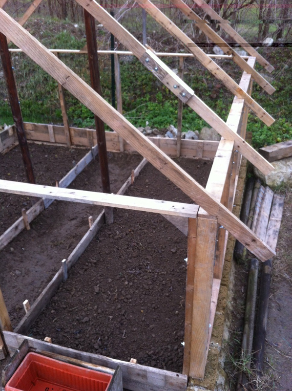 Una volta raccolto il materiale e "ripulito" si può pensare a come realizzare la serra con quanto disponibile. Noi personalmente abbiamo realizzato individualmente le quattro pareti verticali, per poi posizionarle ed unirle direttamente nel luogo di "dimora". Molte volte le dimensioni delle assi derivanti dai bancali non sono state sufficienti a realizzare la struttura come volevo, ad esempio nelle travature, e di conseguenza ho duvuto procedere ad unioni.