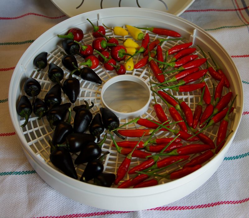 ho deciso che questo raccolto è l'opportunità giusta per sperimentare il mio nuovo essicatore, perciò ho lavato tutti i peperoncini, asciugati una mezzoretta al sole e messi su un piatto dell'essicatore Allegato: