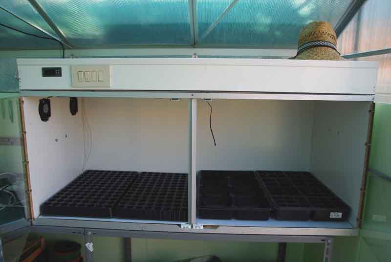 nel coperchio ho inserito il pannello di comando, interruttori per accendere e spegnere l'illuminazione e il riscaldamento, il controllore di temperatura che comanda direttamente il cavo riscaldante, munito di una sonda che rileva la temperatura sopra le piantine