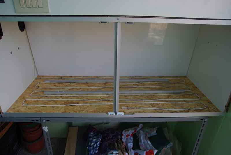 come si vede ci stanno comodi 4 palette per le piantine, posso far crescere qualche centinaio di piante contemporaneamente, ora vediamo i particolari, ecco sul fondo il cavo riscaldante comprato in un negozio per rettilari