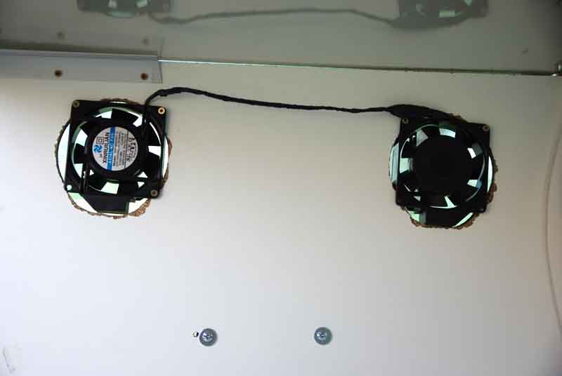 ho inserito anche due ventoline per far circolare l'aria, una soffia aria all'interno e l'altra la estrae, queste le ho trovate ad una fiera dell'eletronica direttamente a 220 volt così da non dover utilizzare trasformatori vari...