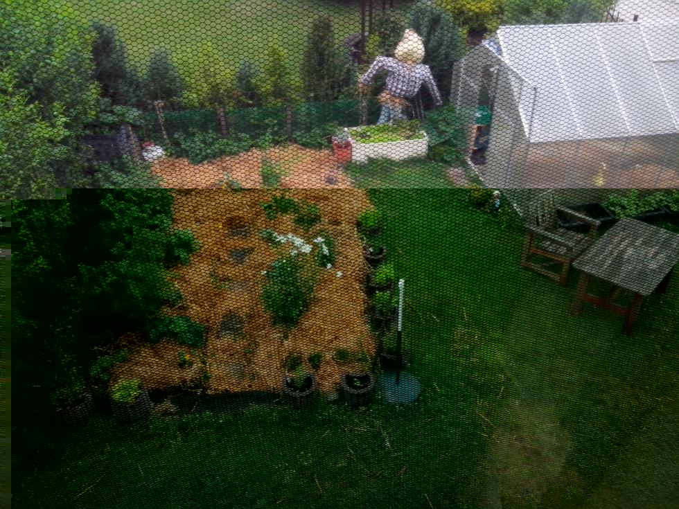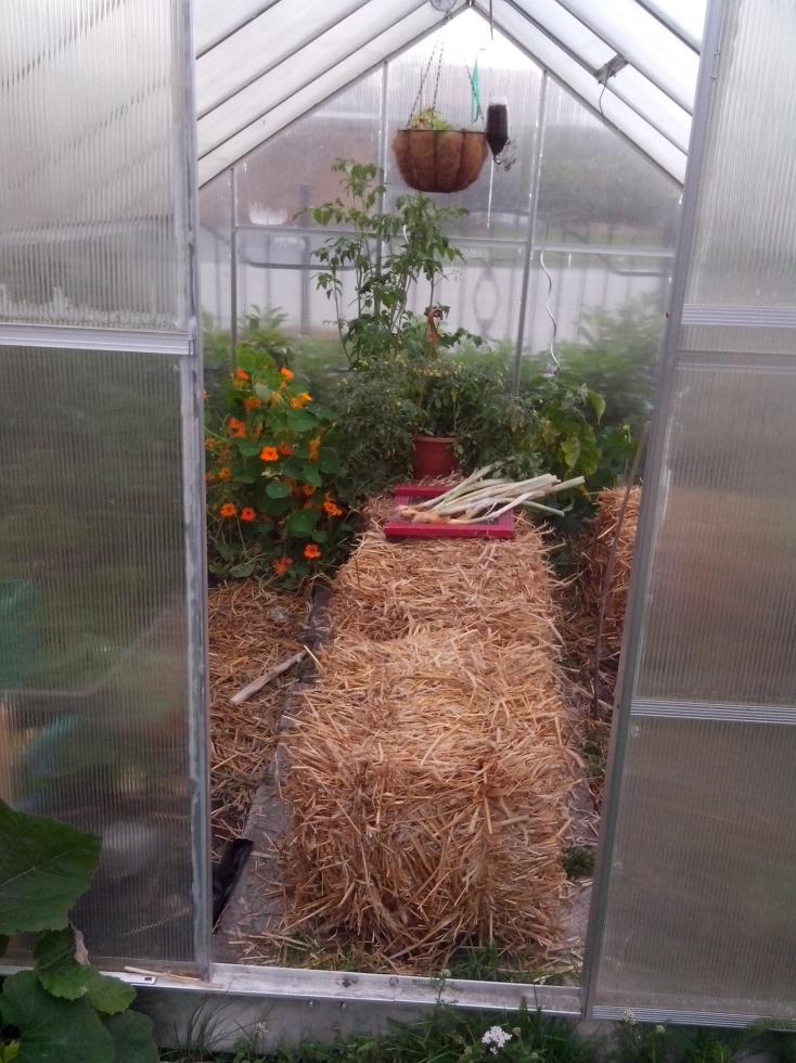 Attuale visuale della serra... le balle di fieno centrali hanno il duplice effetto di regolare l´umidità all´interno (qui piove tantissimo e il terreno e´ molto bagnato Sono un ottima panchina per riposarsi e scruttare le crescite  Inoltre sostituiscono gli agganci come piano d´appoggio per le piante che sono appese (che altrimenti sarebbero solleciterebbero troppo la struttura, vedi pomodori)