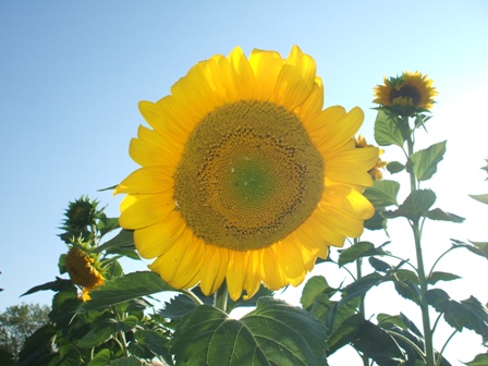 Opera d'arte, quei pomodorini, Rizoma.... e l'alcea! la mia non cresce, mi sono rassegnata, non va ed ora non posso fare di più per lei. Mi godo la tua, allora... A proposito dei girasole, in realtà ve ne erano alcuni che crescevano più piccolini, allora li ho diradati ed ora crescono allegramente in un'aiuola, tra poco fioriranno anche loro... e saranno bellissimi. Intanto ecco uno dei giganti,bello come il sole, libero e sfrontato, guarda tutti dall'alto verso il basso e a ragione si vanta "io sono il più bello"!
