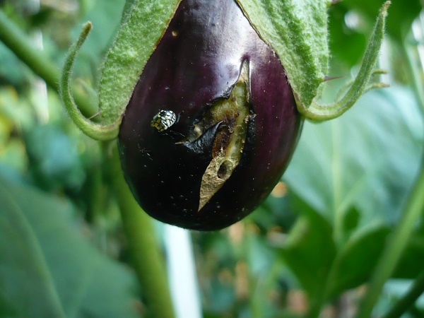 raccolta cimici, il danno nella melanzana e stato causato dalle cimici, ieri in quel punto ne ho eliminate una dozzina. cmq meglio la raccolta manuale e qualche frutto da buttare che spargere veleni