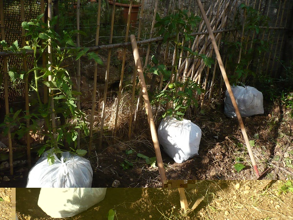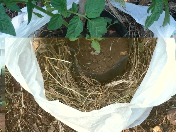 piccoli esperimenti  ormai il caldo fa asciugare velocemente la terra nei vasi, sto coltivando dei pomodori costoluti ibridi in fitocella. per mantenere una certa umidità ho riempito delle buste di plastica con erba secca, le innaffiature faranno evaporare l'acqua mantenendo il tutto abbastanza umido.