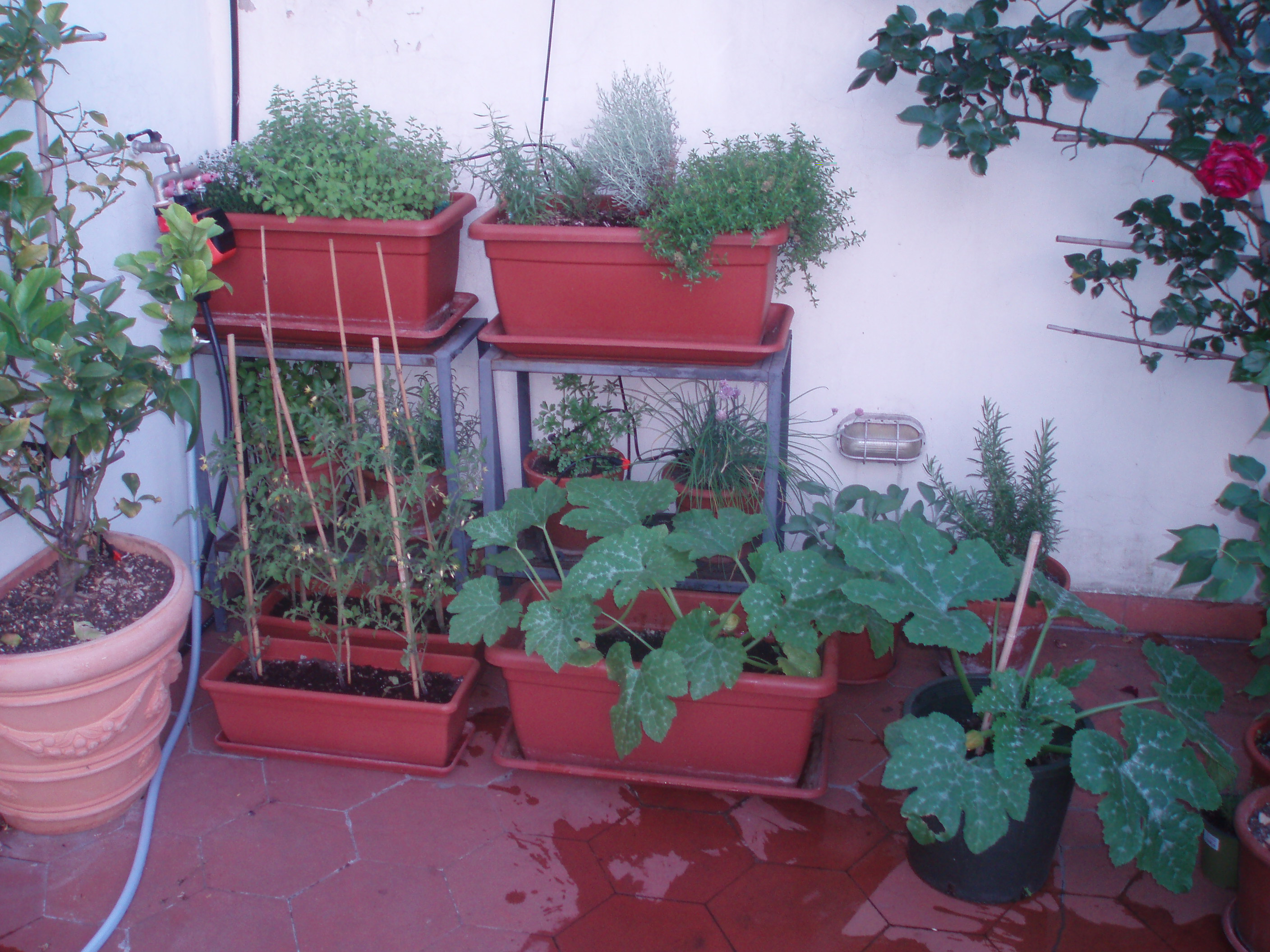 Marco ha scritto: Ecco un po' dei miei ortaggi in terrazzo. Ciao, Marco Mica male. Quelle piante di zuchine (?) sono bellissimi. Qui a casa è tutto fermo o quasi. Ho già mangiato i ravanelli e adesso stiamo mangiando delle latughe. Un'altra cosa che non posso fare a meno di parlare è su quella tua rosa rossa. Sembra bem adattata in quel vaso. Immagino sia anche profumata?