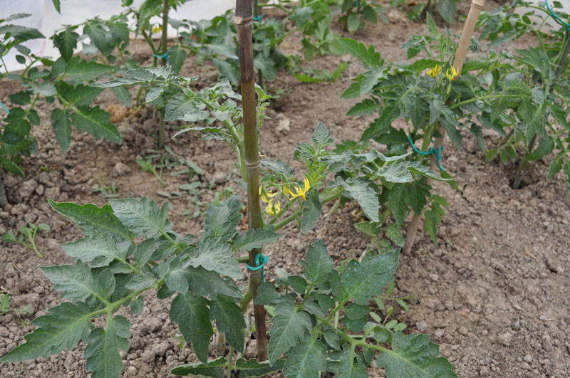 I pomodori san marzano hanno già parecchi frutti, anche le melanzane iniziano a produrre.