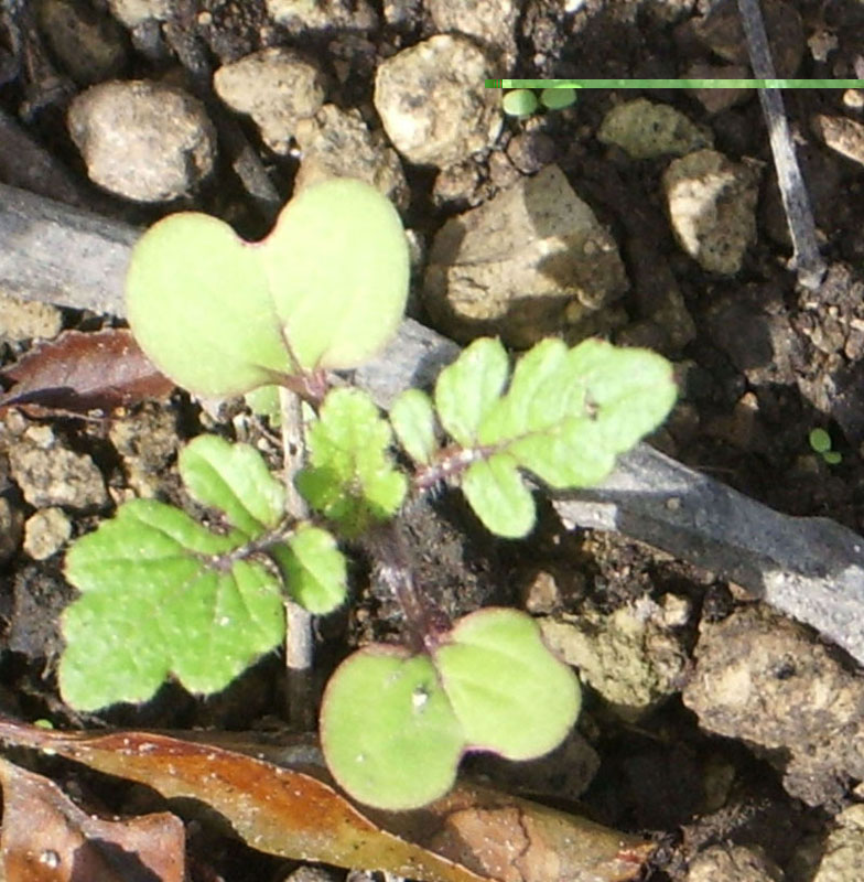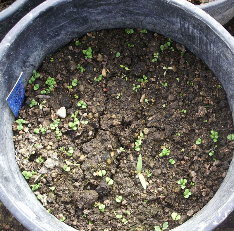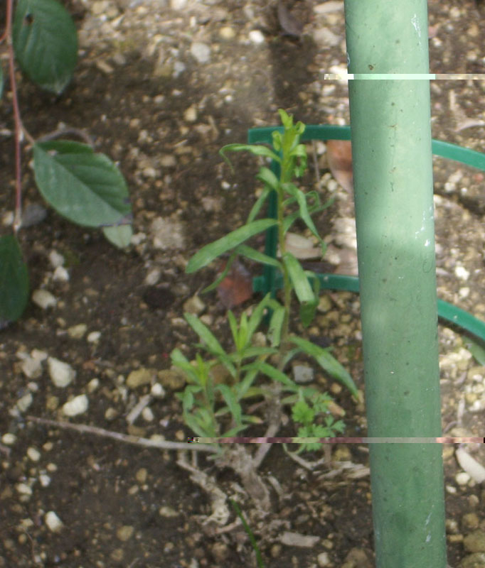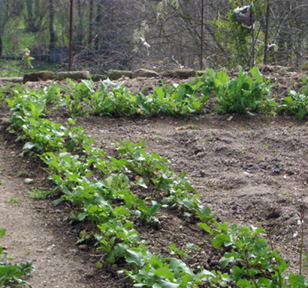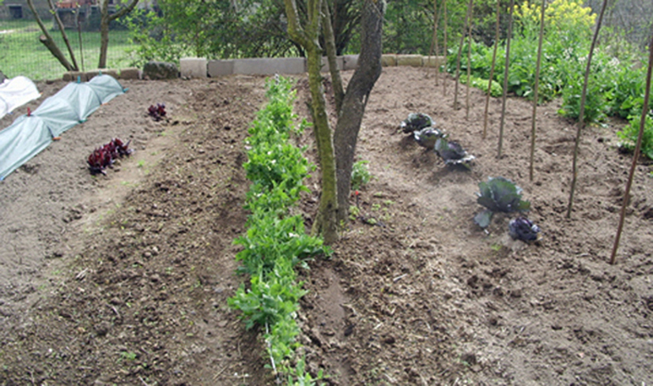 I foto: si vedono rimanenze di: cicoria rossa, cavolo cappuccio rosso, e tra di loro i piselli seminati a dicembre.