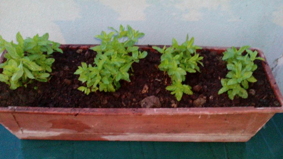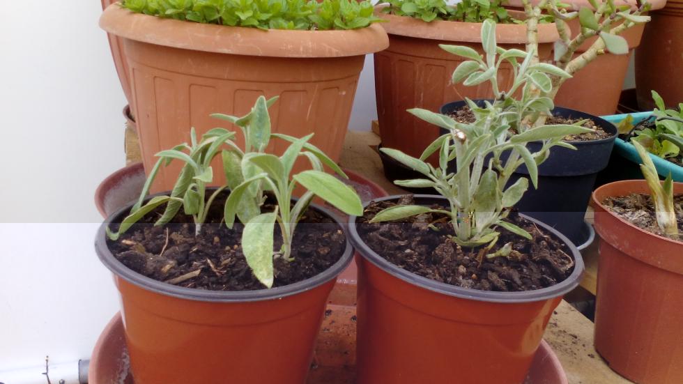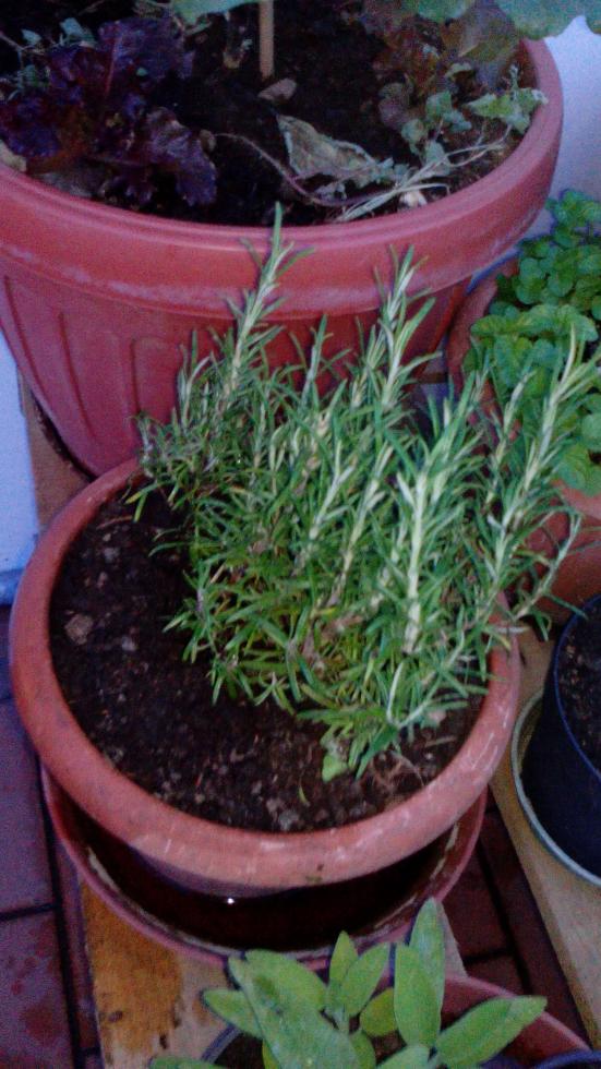 ho trapiantato il rosmarino che in mezzo alle due piante di salvia era sofferente. La piperita "espropriata" di vaso tondo a causa del rosmarino l'ho messa nel vaso lungo....chissà che riesce a svilupparsi meglio. Crescono intanto le talee di salvia che mi sono state commissionate.