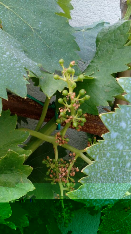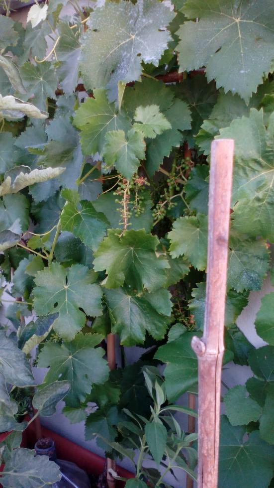 La vite piantata l'anno scorso ha già fiorito e inizia ad ingrossare gli acini. Sono rimasto sorpreso che anche una di quelle piantate a marzo abbia fatto già quest'anno un grappolino :o
