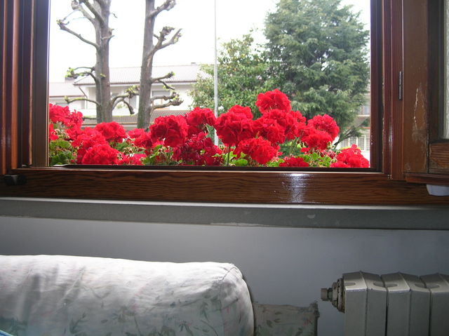 La tregua è finita...grossi goccioloni ricadono con violenza sulla terra...allora torno dentro e questo meraviglioso davanzale ( ve l'ho detto no che ho messo i gerani rossi dappertutto?) mi rincuora e mi rinfranca....che piova pure...io i fiori li ammiro anche seduta sui miei divani: Allegato: