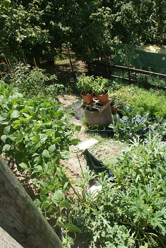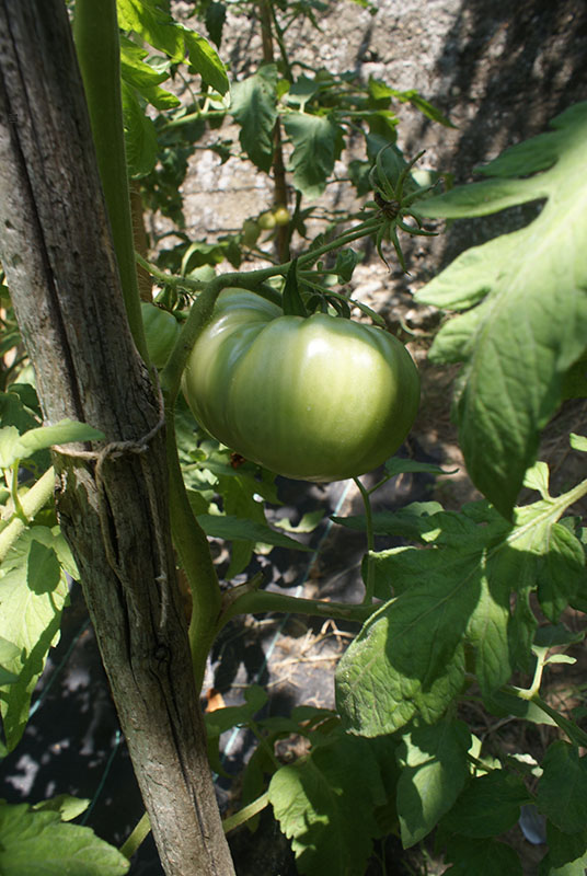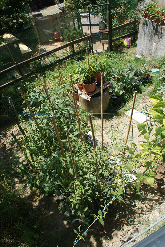 in pratica ho prolungato la spalliera aiutandomi con la righiera che sovrasta l'orto..così facendo sono riuscito a dare un'appoggio a tutte quelle cime (o alla maggior parte di esse) che ormai superato di parecchio la fine della spalliera si erano piegate su se stesse iniziando a crescere verso il basso e incasinandosi in giro..