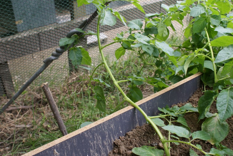sulla foglia di peperoncino potrebbe essere peronospora... togli tutte le foglie malate e dai un pò di rame, stando attento ai fiori. quelli sui piselli sono afidi, quest'anno sono pieno anche io ma da me preferiscono i fagioli. devi intervenire altrimenti si moltiplicano velocemente. se nn sei infestato il macerato va bene, altrimenti piretro. le patate sembrano andare bene e non rincalzarle più altrimenti per tirarle fuori devi affittare un escavatore... quella pianta di patate in foto non sò cosa sia però una passata di bordolese la darei anche a lei