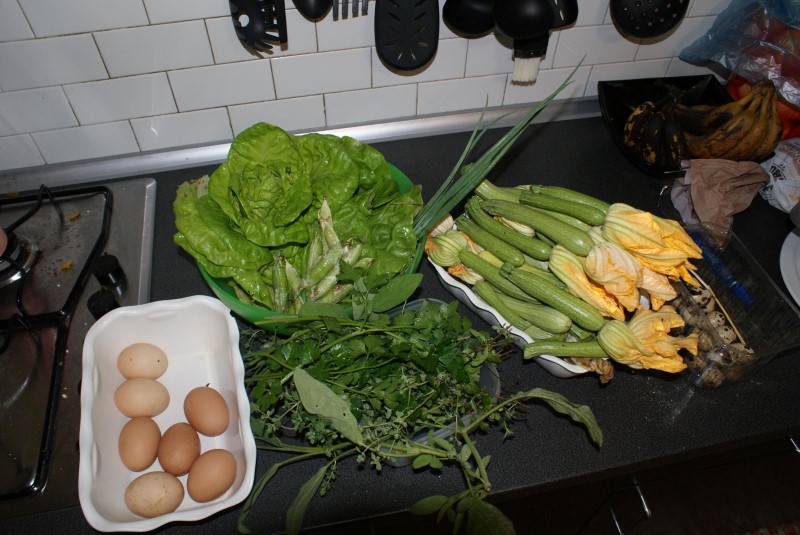 stasera direi frittate di erbette ,zucchine e cipollotti e fiori di zucchina ripieni in pastella contorno insalata e piselli(gli ultimi a quanto pare ) al burro