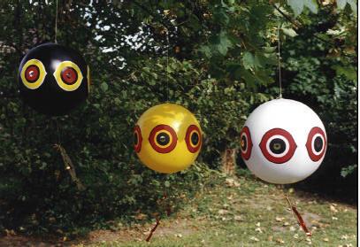 Robby ha scritto: merli e storni sono stati piu' veloci di me Come fai a non farle mangiare dagli uccelli? Ciao Roberto, questa pianta di ciliegie è ad una ventina di metri da casa, quindi già il nostro movimento giornaliero nei dintorni non fa avvicinare tanti uccelli, comunque i primi anni per le piante più lontane abbiamo utilizzato dei palloni gonfiabili colorati che hanno al centro degli "occhi" argentati (ti allego un'immagine reperita in rete, io li ho tutti e tre), oppure sulla punta di varie canne posizionate tra la pianta (o direttamente sui rami più alti) legavo le carte argentate e colorate delle confezioni delle uova di Pasqua, così sventolando sia i riflessi che il rumore tenevano lontani tutti i volatili. Per alcuni anni funziona, poi ci sarebbe da inventarsi altro o alternare vari metodi! Proprio l’altro giorno un’amica mi ha detto che un suo vicino di casa da mattina a sera tiene accesa la radio sotto la sua pianta di ciliegie! Domani sarà il turno della raccolta di amarene e tra qualche giorno delle visciole.