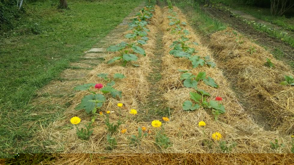 Qui siamo in maggio. Le piantine crescono. Le zucchine le abbiamo prima seminate in serra e poi trapiantate.