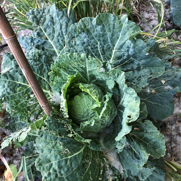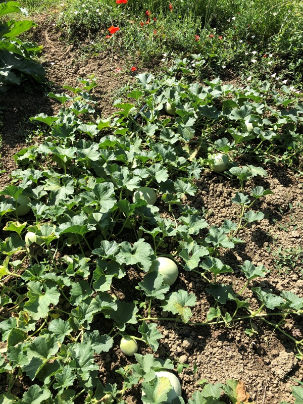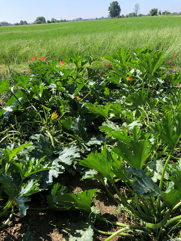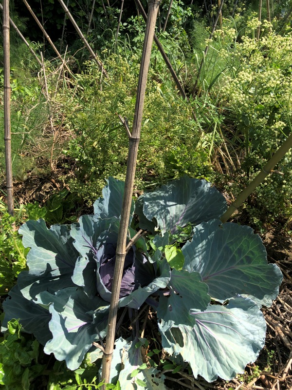si comincia a vedere le prime zucche , mentre gli zucchini vanno alla grande. anche nella parte dedicata al sinergico i pomodori crescono bene , questo cavolo viola è pronto