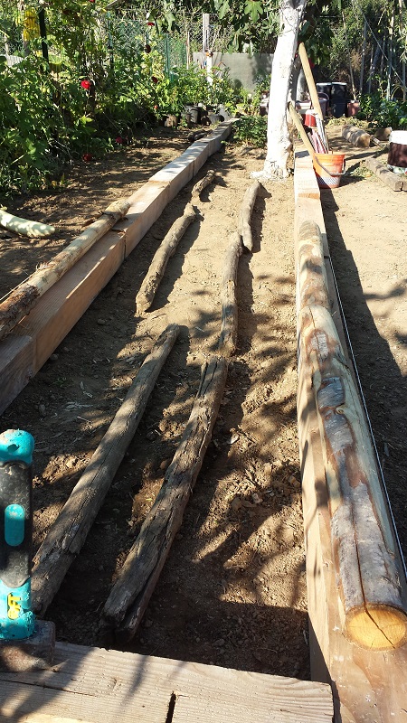 Foto dell'aiuola di cinque anni fa - la preparazione dell'aiuola hungelkultur. La motivazione di questa aiuola: le fragole si annaffiano una o due volte d’estate. Si risparmia di acqua (quindi di corrente) e di schiena; sinceramente, solamente quest’anno ho dovuto levare un pochino di gramigna che era entrata da sotto nell'aiola. Altrimenti pressoché nessuna erbacea. La terra è quella del compostaggio. Per prima ho messo dei pali vecchi di castagno … Allegato: