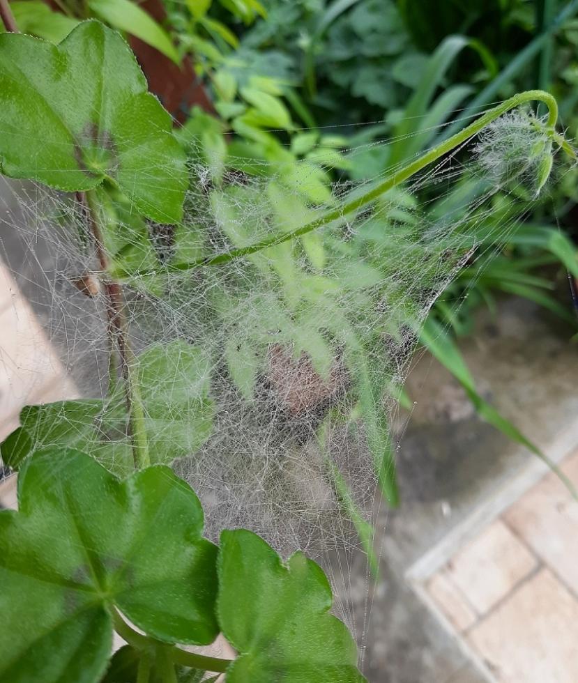 Una bellissima ragnatela sul pelargonium. La lasciamo li ! Io non ho mai avuto problemi con il bruco dei geranei. Allegato: