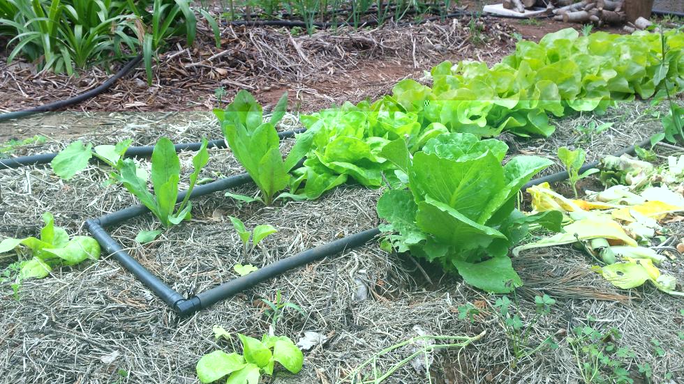 I primi pomodori spuntano tra le foglie. Aiuola con pomodori fagiolini e peperoni in crescita Insalate a diverso stadio di crescita. Basilico e sedano autoseminato (anche la gramigna autoseminata  )