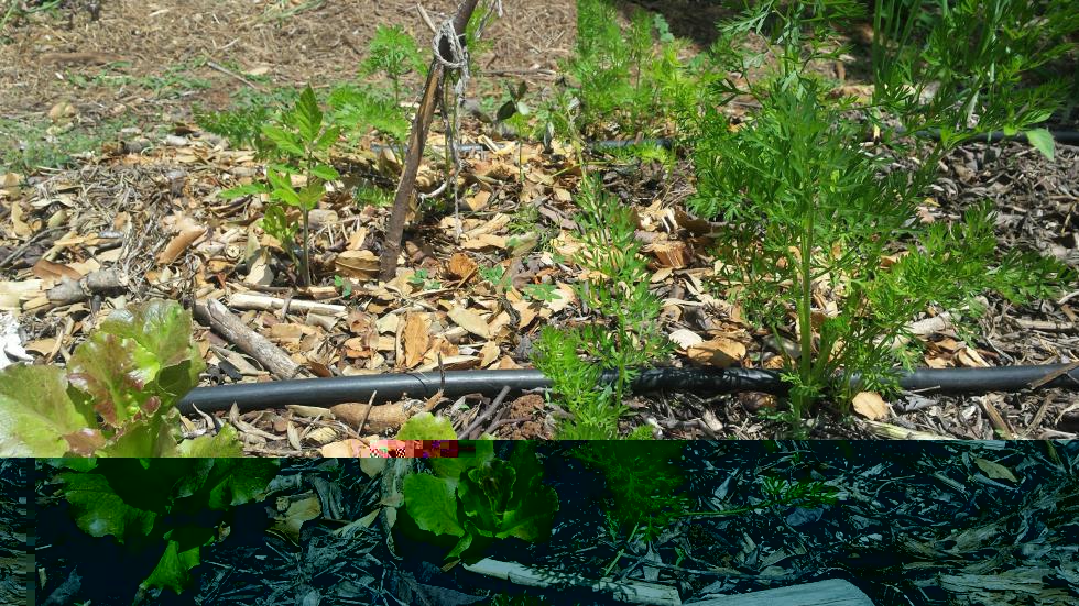Piantine di carote che sono venute su da semi dimenticati sul terreno lo scorso settembre, rimaste all'ombra finora dalle piante di fave e piccole insalate che ricacciano.