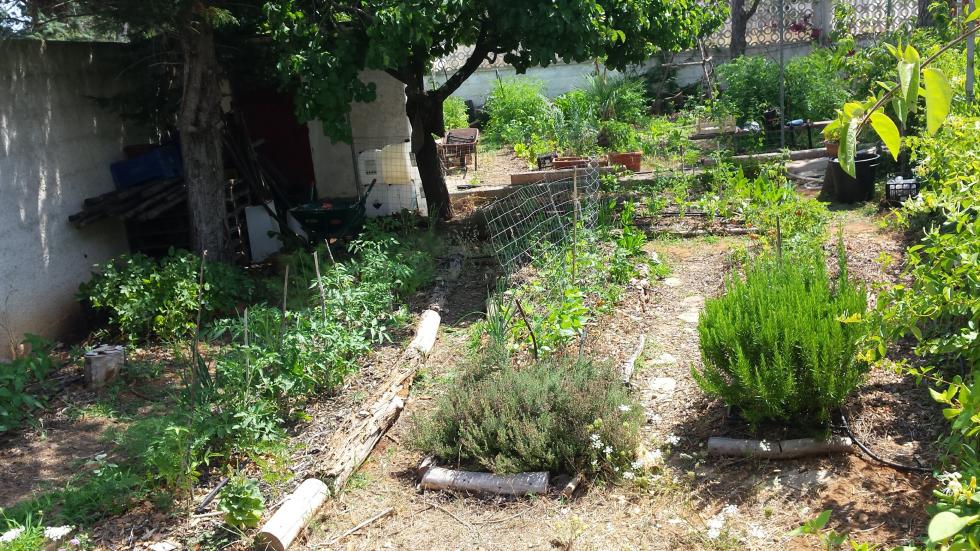 Foto panoramica della parte meno produttiva dell'orto, parzialmente in ombra coperta dall'albicocco e da un orribile abete di cui devo liberarmi al più presto.