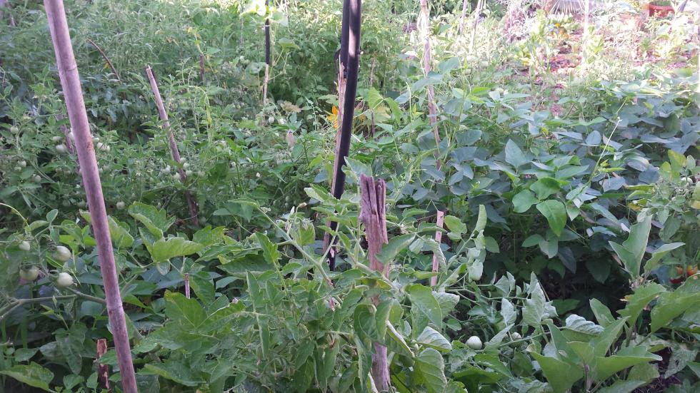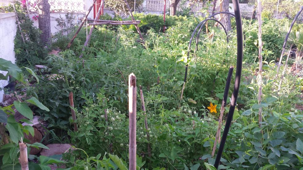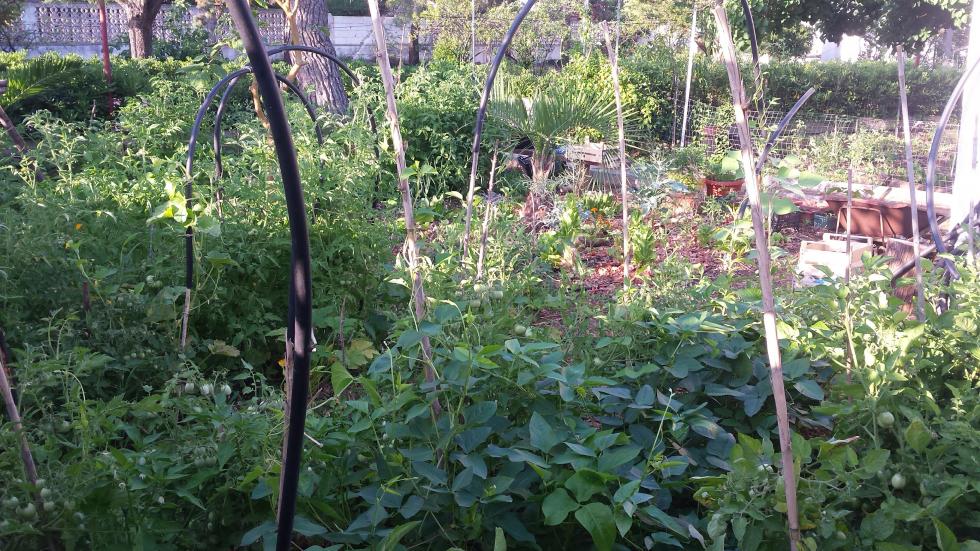 Cerco di imitare un po' i principi dell'orto sinergico, anche se con il nostro clima e con la nostra terra è molto difficile. Quest'anno mi sembra che tutto stia venendo su abbastanza bene, anche se c'è un po' troppo caos, i pomodori che sommergono tutto, i fagiolini che si acchiappano a qualsiasi altra pianta appena non trovano un tutore che gli garba, i caroselli che corrono dappertutto ma che non producono niente, solo splendidi fiorellini gialli, idem le zucchine, a parte le prime che poi ho spiantato e sostituito ieri, le altre sono un tripudio di fiori tutti maschi, mah ... aspettiamo le ultime trapiantate vediamo che combinano. Melanzane e peperoni stanno arrivando a frutto sembra senza problemi.