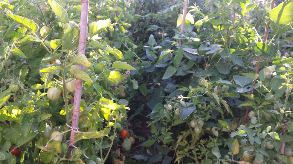 Ho notato un bel numero di cimici che scorazzano nell'orto passando da un pomodoro a un fagiolino come se fossero le padrone. Su alcuni pomodori ho visto dei piccoli ragnetti neri, altri pomodori sono mangiucchiati ed altri si stanno spaccando, probabilmente per l'effetto combinato di sole e acqua. Ma non importa, ce ne sono talmente tanti che non sappiamo come consumarli.