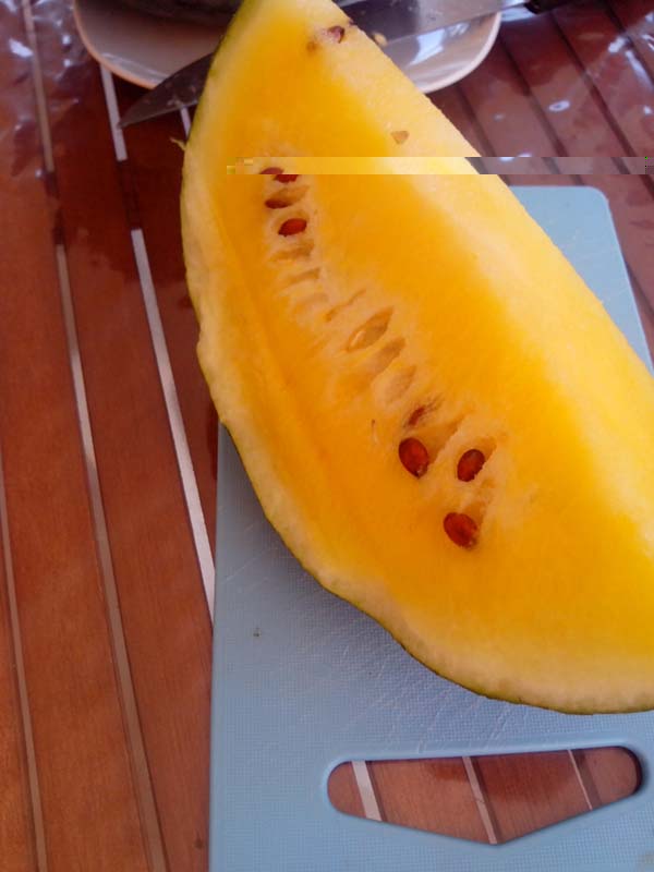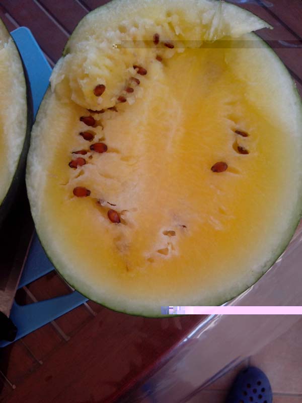 FINALMENTE raccolta l'anguria gialla.... abbastanza piccola di volume  ma...... ottima !!!!! peccato che ancora non abbiano trovato il modo di far arrivare i profumi sul web !!!!!!