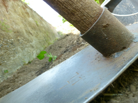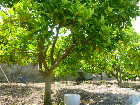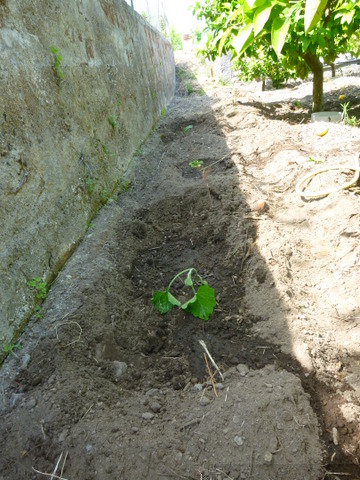 Eccomi di nuovo! dopo mangiato ho, senza poca fatica, portato con la carriola su per i terrazzamenti il letame di coniglio per realizzare quattro fratte in cui alloggiare 4 piantine di zucca (tra cui un' Hokkaido). L' Hokkaido si trovava vicino ai pomodori, ma stava male, secondo me per mancanza di sole e terreno in quella zona poco dissodato... così ho deciso che l'avrei messa a dimora in un altro luogo... Mi è venuto subito in mente il soleggiato agrumeto di famiglia, nel cuore del nostro vigneto da cui ricaviamo ogni anno una discreta quantità di vino per il consumo familiare. Ho allora zappato, aggiunto il letame e messo a dimora l'Hokkaido + altre 3 piantine del grosso terreno di famiglia.