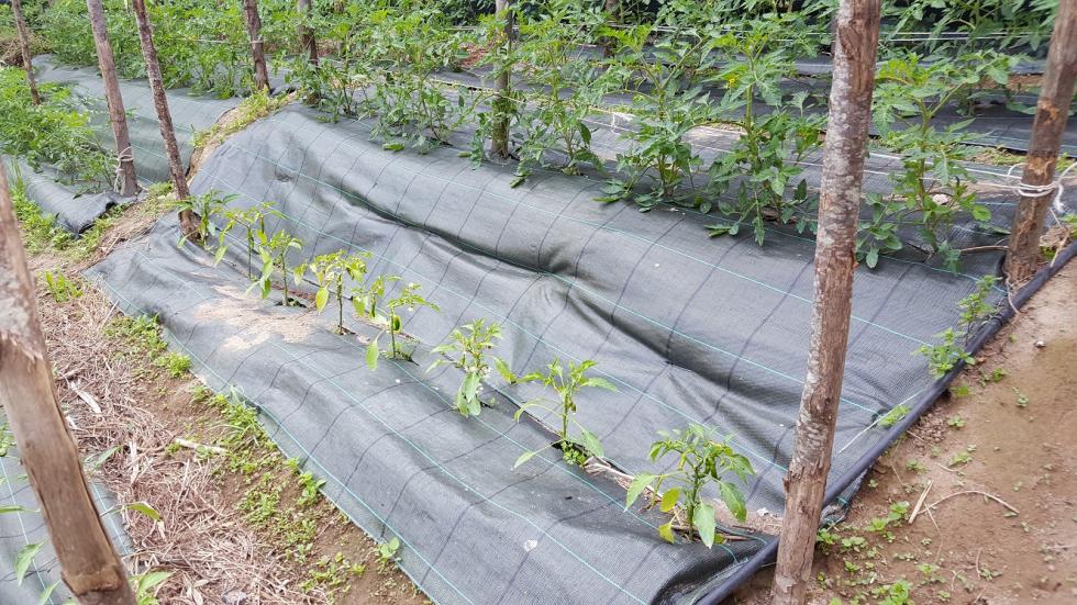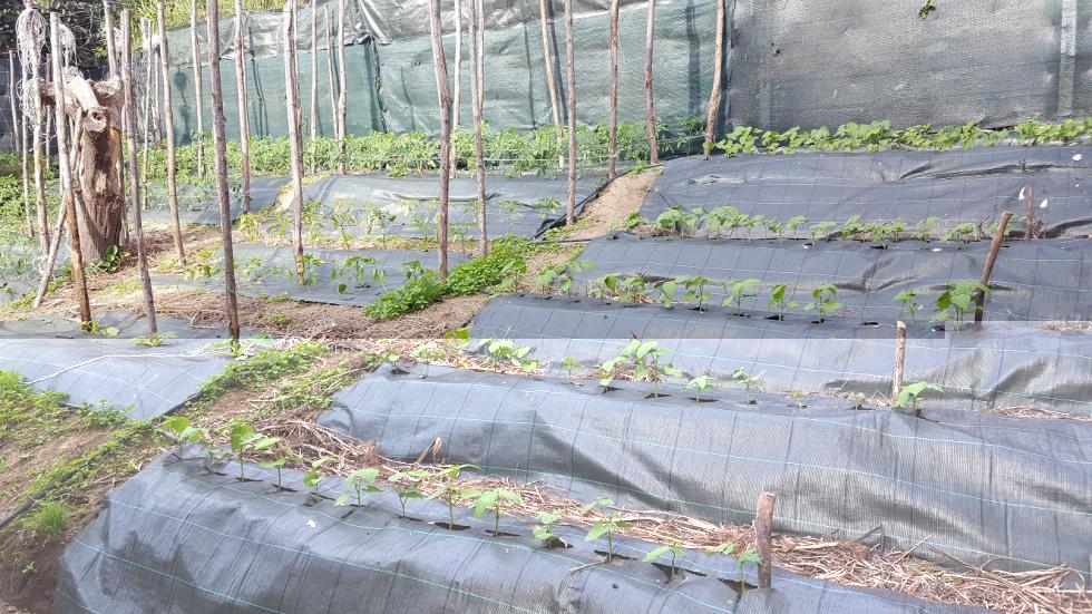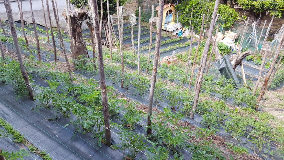 Come si può notare dalle foto la zona adibita ad orto è in forte pendenza. Quando sono arrivato era un pendio, poi con tanto olio di gomito e vanga ho provveduto pian piano a terrazzarlo fino a farlo diventare come lo vedete. Per questioni di esposizione al sole ho la possibilità di utilizzare l'intera area solo durante la primavera-estate-inizio autunno, per cui in inverno lascio riposare il terreno e preparo giusto poche cose nell'unica piccola fascia di terreno che resta assolata. Da fine Gennaio mi dedico alla preparazione delle prode per le colture "estive" e lo faccio in modo molto semplice: passaggio di vangatura profonda "a mano" (senza ribaltare le zolle) che smuove ed ammorbidisce il terreno, aggiunta di stallatico in pellet, passaggio di zappa "a mano" per sbriciolare il tutto, disposizione dell'ala gocciolante (autocompensante) e, da quest'anno, ricopertura con telo (prima pacciamavo con paglia di grano)... Non aggiungo altri fertilizzanti e non eseguo trattamenti a meno che non noto nelle piante delle carenze o delle anomalie (afidi &CO). Posterò a breve tutti gli altri particolari...