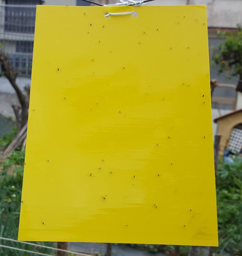 Sono passati quattro giorni e al controllo fatto stamattina dopo una discreta pioggia, posso dire che hanno catturato centinaia di afidi, mosche bianche e qualche piccolo coleottero che ancora non mi sono preso la briga di identificare. Nessun'ape per fortuna, nonostante ne girino diverse, a conferma del fatto che queste vengono attratte dalla scia chimica del nettare piuttosto che dal richiamo cromatico, o forse da una combinazione di entrambi.