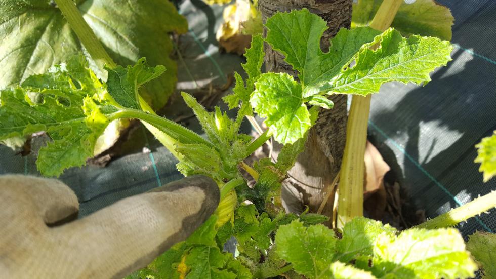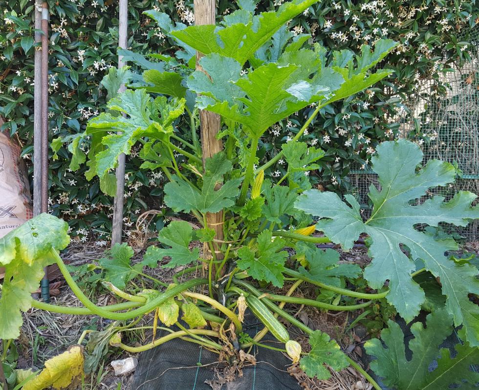 Infine le zucchine. In questo caso alcune piante sparse in vari punti dell'orto stanno procedendo bene come quella in foto, attaccata al suo palo che la guida in verticale Allegato: