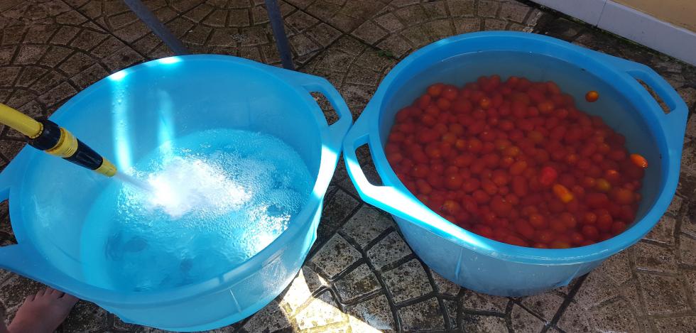 Si passa alla trasformazione in conserva entro poco tempo, per preservare tutte le qualità del raccolto. Iniziamo con un bel ciclo di 2-3 risciacqui in acqua bella fredda (ci sono circa 28°C all'ombra sul mio terrazzo) Allegato: