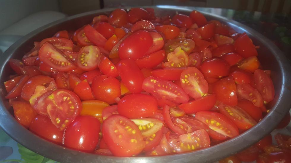 Poi si tagliano i pomodori in 2 o 4 parti, a seconda della dimensione Allegato: