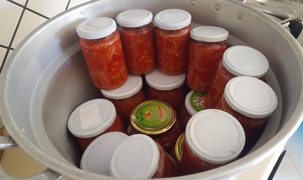 Si sistema il tutto in un pentolone in maniera ordinata, impilando i vari contenitori, quindi si riempie di acqua e si porta ad ebollizione. Da quando inizia la bollitura si attendono 20-30 minuti e si spegne, lasciando il tutto così com'è fino al completo raffreddamento (ci vogliono anche più di 12 ore) Allegato: