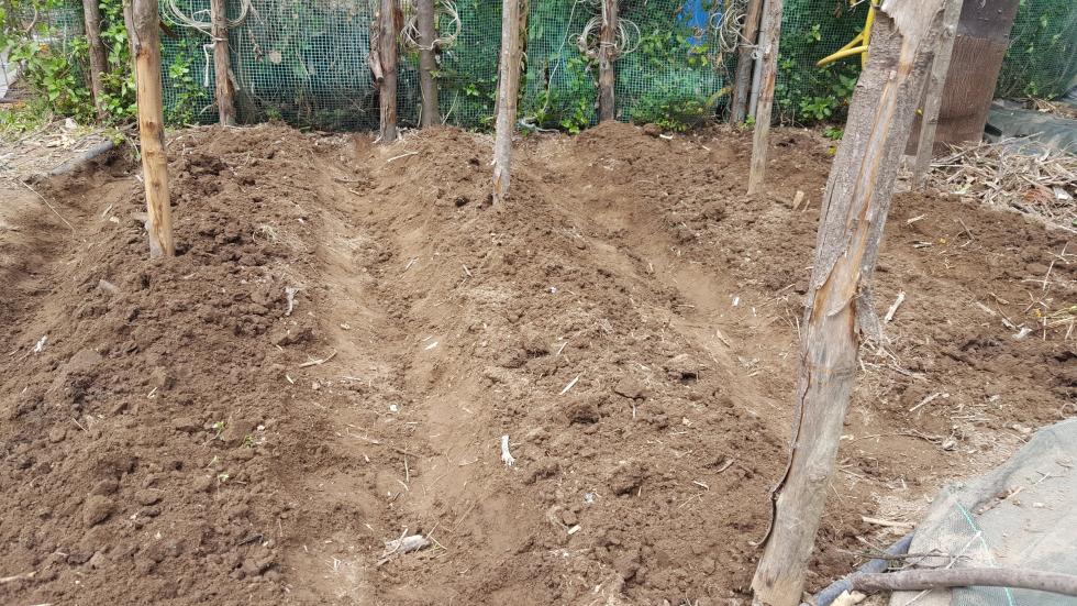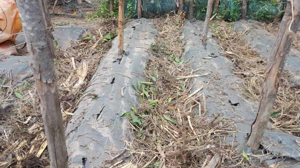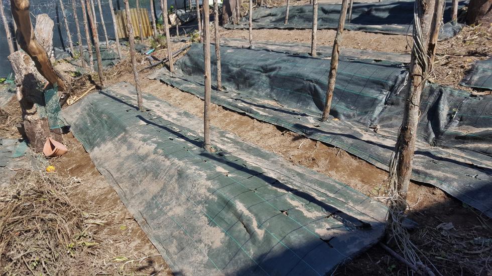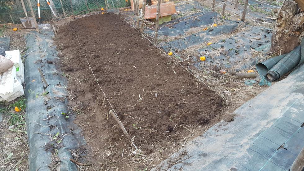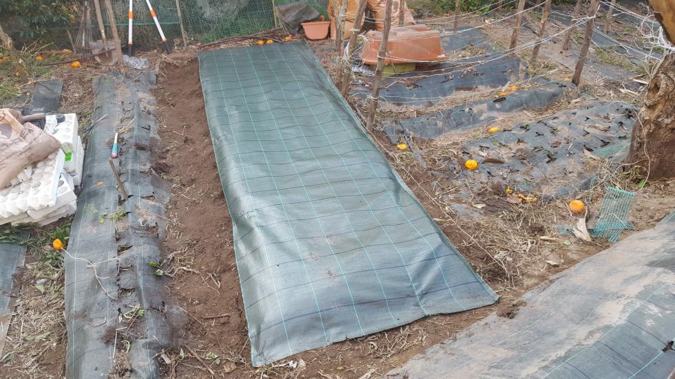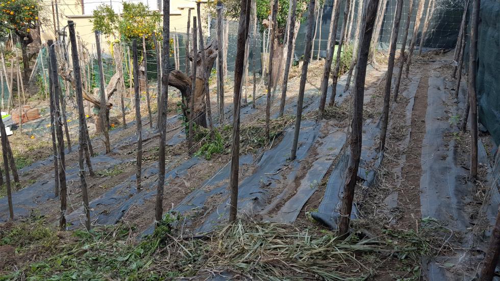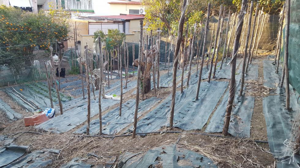 Intorno alla fine di Febbraio inizio la preparazione delle prode. Dallo scorso anno ho introdotto la novità dei teli in polipropilene, non sempre graditi per via della presenza di plastica, ma che personalmente ho trovato molto pratici e resistenti, tra l'altro se si passa una fiamma sui bordi derivanti dai "tagli" gli sfilacciamenti sono davvero molto contenuti se non assenti. Vista la selva di pali tenuti insieme da un intricatissimo dedalo di fil di ferro che non avevo voglia di districare, ho deciso di preparare le prode senza rimuoverli, sollevando semplicemente i teloni e lavorando sulla linea fra i pali. Sollevato il primo telone mi sono reso conto che il terreno rimasto coperto aveva mantenuto la sua morbidezza come quasi appena zappato, uno spettacolo per i miei occhi e per le mie mani che affondavano quasi incredule per 20 cm almeno Allegato: