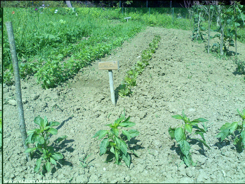 Pomodori e pomodorini (la foto è di più di 10 giorni fa, ora le file sono un po’ più folte). Allegato: