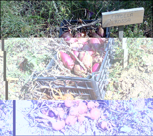 Raccolte le cipolle. Le rosse di Tropea (avevamo trapiantato le piantine) buonissime e belle. Le tonde dorate di Parma (avevamo seminato le cipolline), sono venute piccoline.