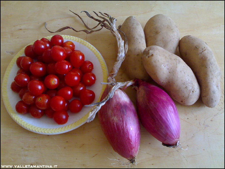 Tre ingredienti: i pomodorini ciliegini, le cipolle rosse di Tropea e le patate di Traco. Allegato: