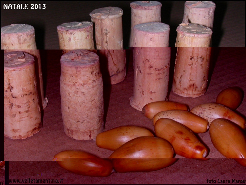 Solo le stelle sono di plastica, per il resto uso sugheri, bacche, pigne, cortecce, ghiande, rametti, noci, paglia, legnetti dei ghiaccioli, sassi…