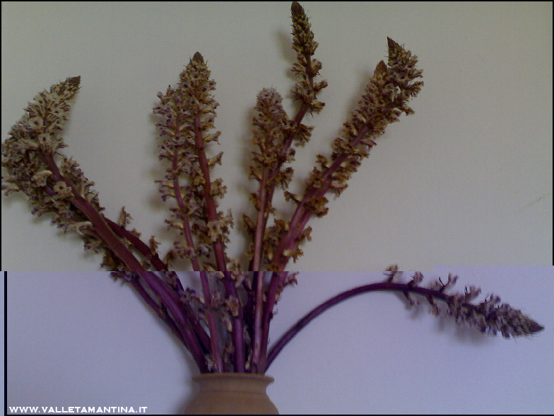 Nel terreno delle fave proprio tra le piante era cresciuta un’erba infestante che non abbiamo avuto tempo di contenere con zappettature o altro. Qui in dialetto la chiamiamo “fiamma”, ho appena trovato in rete che il suo nome è orobanche o succiamele delle fave (nome scientifico: Orobanche minor L.). La conoscete? Questi sono i suoi fiori. Nonostante sia un’infestante altamente dannosa per le fave, tanto da arrivare a “bruciare” le giovani piantine, i fiori sono particolarmente belli e li ho messi in vaso. Somigliano a orchidee di campo o bocche di leone. Allegato:
